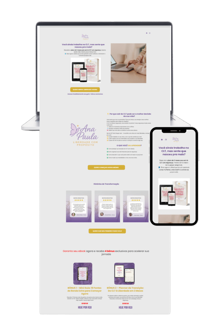 Criação de página de vendas para venda de E-book, com foco em conversão, storytelling e identidade visual feminina.